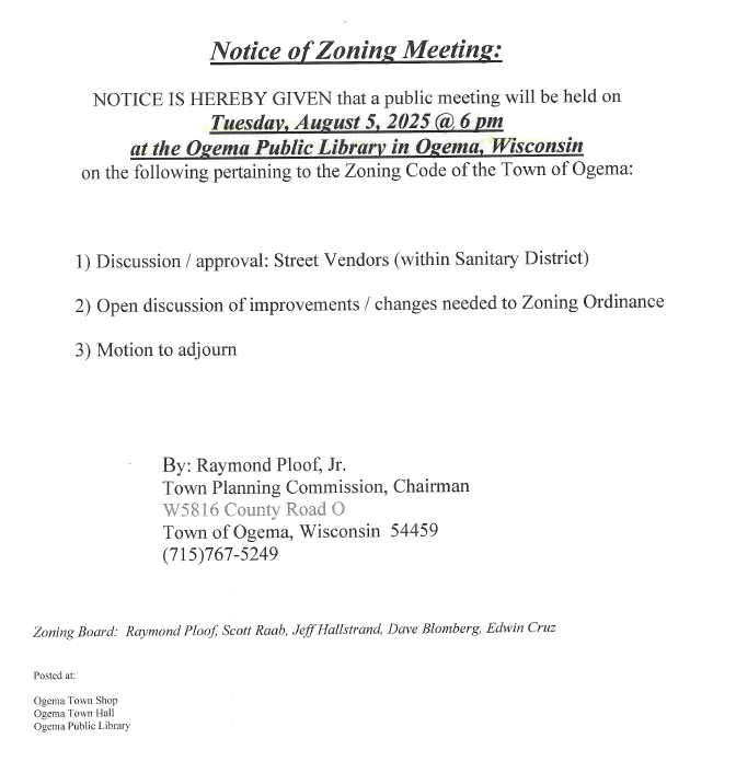 The Ogema Area Our Town Association will be hosting a 50/50 Raffle (need not be present to win), Basket Raffles, and selling ice cream and popcorn at the Depot, beginning at 7pm.