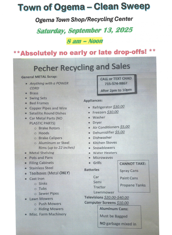 Pecher Recycling and Sales will be back again for a Clean Sweep at the Ogema Town Shop/Recycling Center.